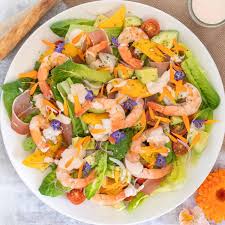 Sitruunalla maustettuja mausteisia katkarapuja pilkotun kurkun, tomaatin ja sipulin kera.